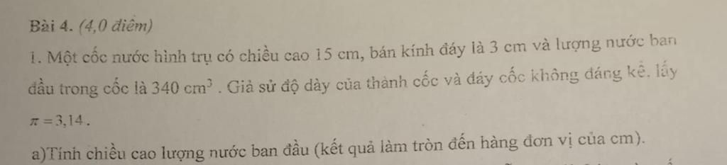 Vậy chiều cao lượng nước ban đầu là khoảng `12` (làm tròn đến hàng đơn vị).