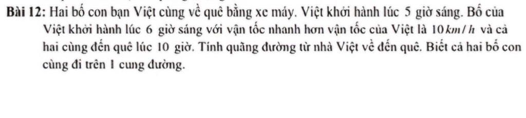 Thời gian bố Việt đi từ nhà đến quê : `10` giờ `-6` giờ `=4` giờ