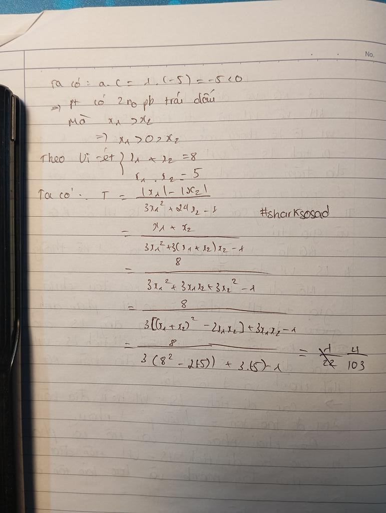 Theo Viét có `x_1+x_2=8; x_1x_2=-5`