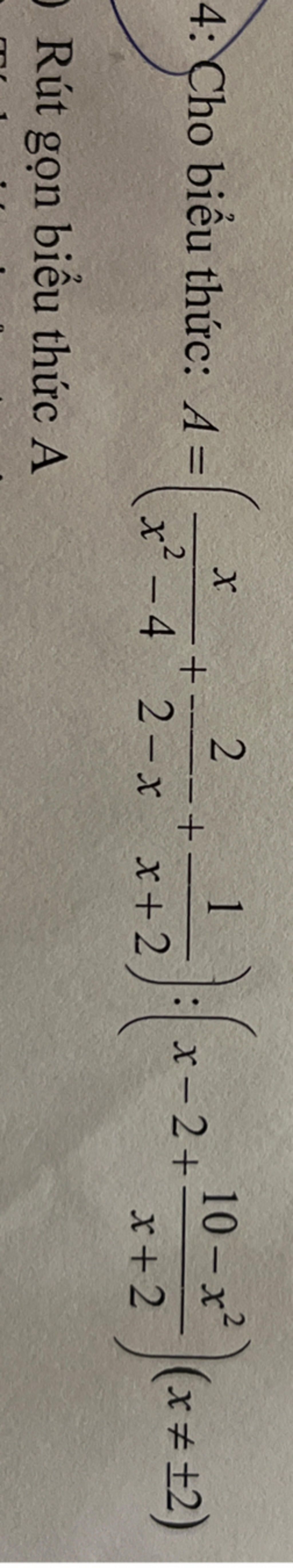 `A=(x/(x^2-4)+2/(2-x)+1/(x+2)) : (x-2 + (10-x^2)/(x+2))(x\ne+-2)`