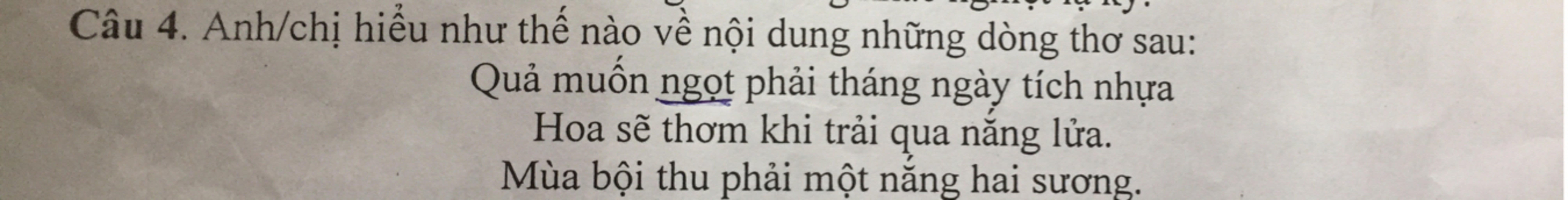 $\Rightarrow$ Hình ảnh “hoa thơm” tượng trưng cho vẻ đẹp, sự hoàn thiện. Nhưng để có được hương thơm đó, hoa phải vượt qua thử thách, khó khăn (“nắng lửa”), cũng giống như con người cần rèn luyện, trải nghiệm mới trưởng thành.