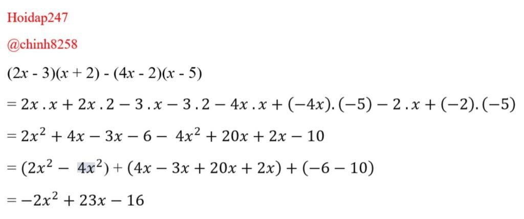 `(2x-3)(x+2)-(4x-2)(x-5)`