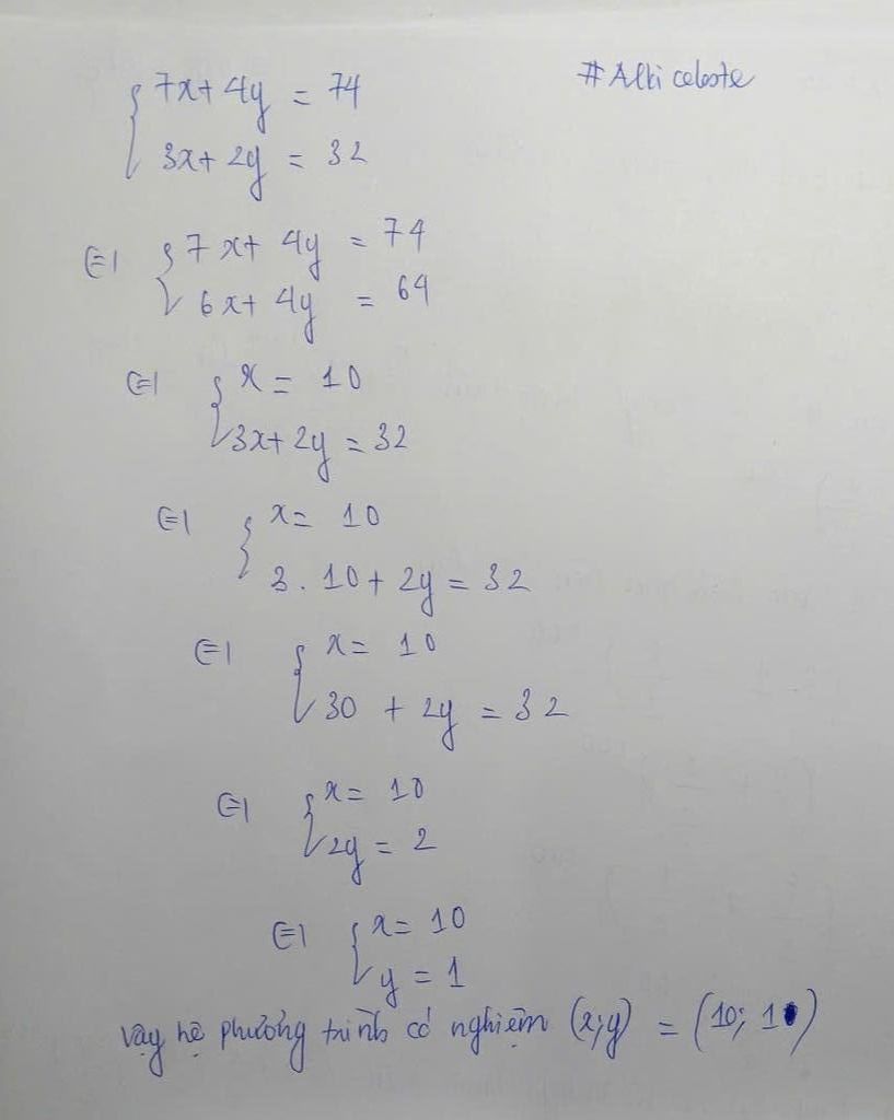 $\begin{cases} 7x +4y=74\\3x+2y = 32\\ \end{cases}$
