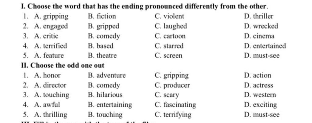 ⇒ 3 đáp án còn lại miêu tả các phim ( phiêu lưu, hấp dẫn, hành động)
