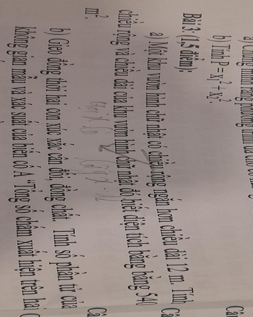 Một khu vườn hình chữ nhật có chiều rộng ngắn hơn chiều dài 12m . Tính chiều rộng và chiều dài của khu vườn hình chữ nhật đó biết diện tích bằng 540m²