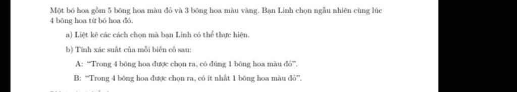 Có biến cố đổi của `B` là không lấy ra một bông hoa màu đỏ nảo mà số hoa màu vàng chỉ có `3` bông mà phải lấy ra `4` bông