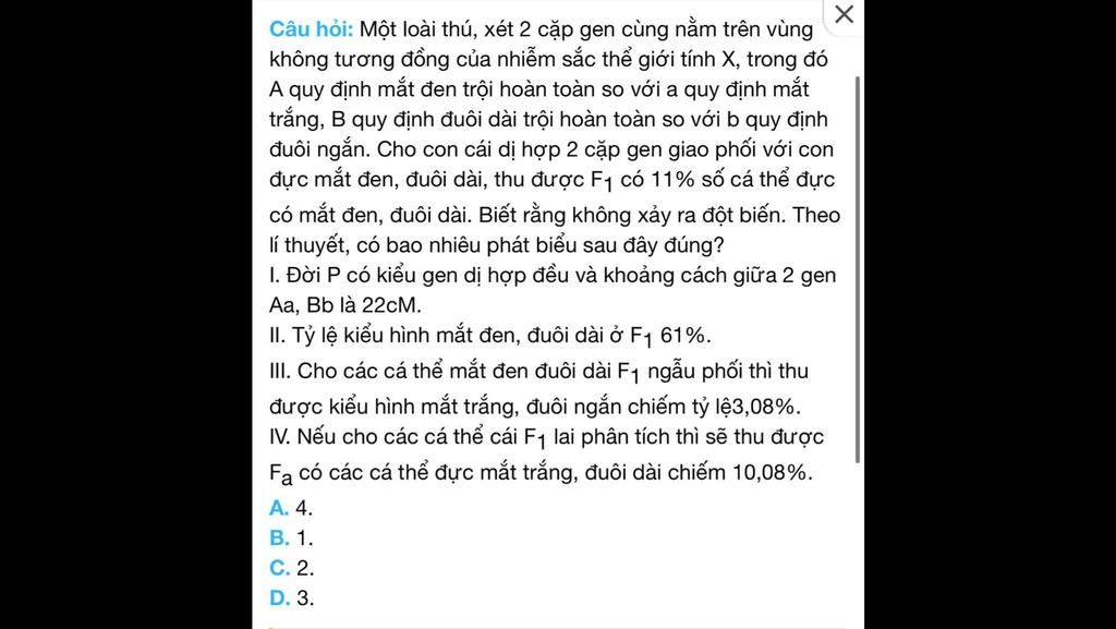 `@` Vì tỉ lệ cá thể đực mắt đen, đuôi dài `= 11%` từ đó phản ánh tần số hoán vị giữa hai gen là `22cM`.