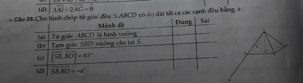 a) Đúng. Chóp tứ giác đều đáy là hình vuông