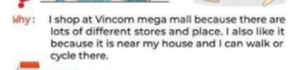 Tại sao`:` Tôi mua sắm ở trung tâm thương mại Vincom bởi vì có rất nhiều những cửa hàng và địa điểm khác nhau. Tôi cũng thích nó bởi vì nó gần nhà tôi và tôi có thể đi bộ hoặc đạp xe đến đó