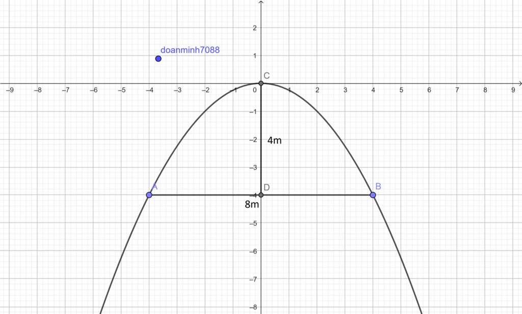 + Một cái cổng vòm hình parabol y = ax2 (a < 0) được thiết kế cao 4 mét, khoảng cách giữa hai chân cổng là 8 mét. Người ta muốn căng dây đèn nhấp nháy tử thành cổng bên này sang thành cổng bên kia ở độ cao 3m so với mặt đất. Hãy xác định hệ số a và cho biết độ dài của dây đèn nhấp nháy là bao nhiêu mét?