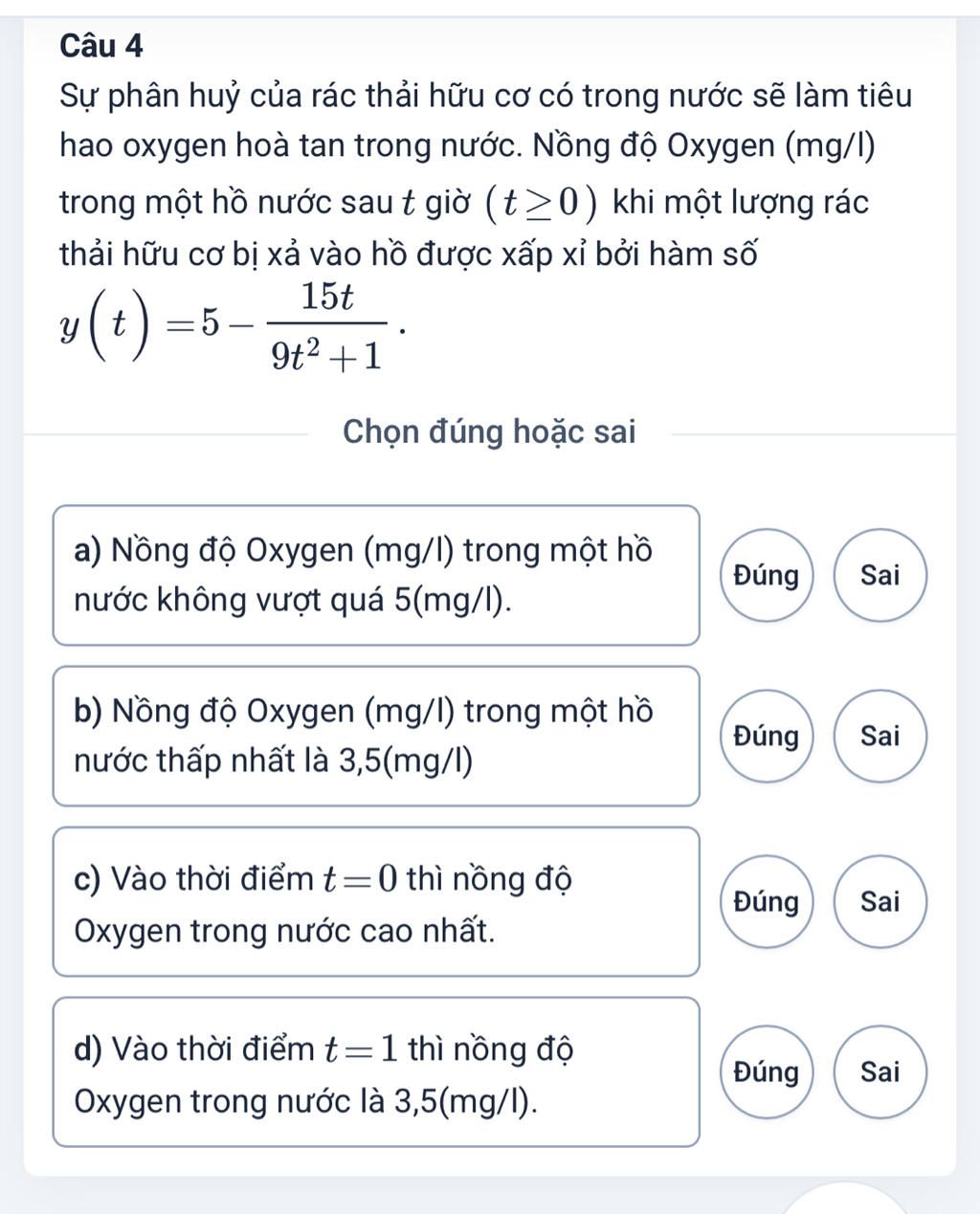 trong một hồ nước sau t giờ (t>0) khi một lượng rác