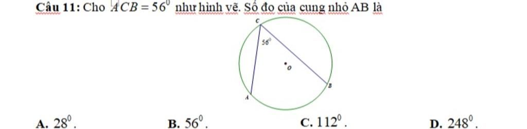 Nên `\hat{AOB}=2.\hat{ACB}=2.56^o=112^o`