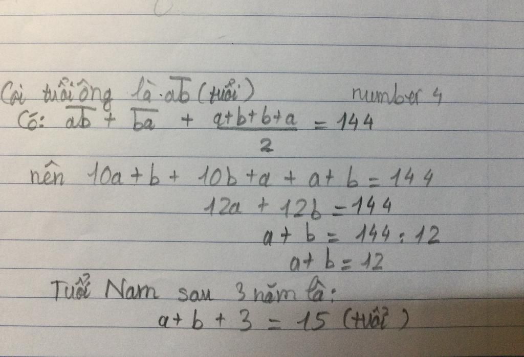 Năm nay tổng số tuổi của ông nội bố và Nam là 144 tuổi điều đặc biệt là hai chữ số trong số tuổi của ông viết theo thứ tự ngược lại thì được tuổi của bố cộng tất cả các chữ số trong tuổi của ông và bố thì được một số gấp đôi tuổi nam tên tôi Nam sau ba năm nữa