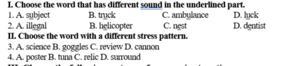`I.` Chọn từ có cách phát âm khác ở phần gạch chân