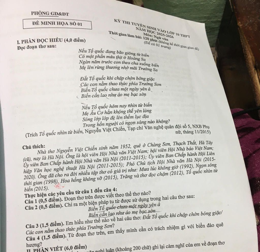 Câu 2. Trong hai dòng thơ Biển Tổ quốc chưa một ngày yên ả / Biển cần lao như áo mẹ bạc sờn, tác giả đã sử dụng biện pháp tu từ so sánh để nhấn mạnh những thách thức, nguy cơ mà biênr Tổ quốc phải đối mặt hằng ngày, hằng giờ. Đằng sau mỗi câu chữ là nỗi trăn trở của nhà thơ về biển đảo tổ quốc.
