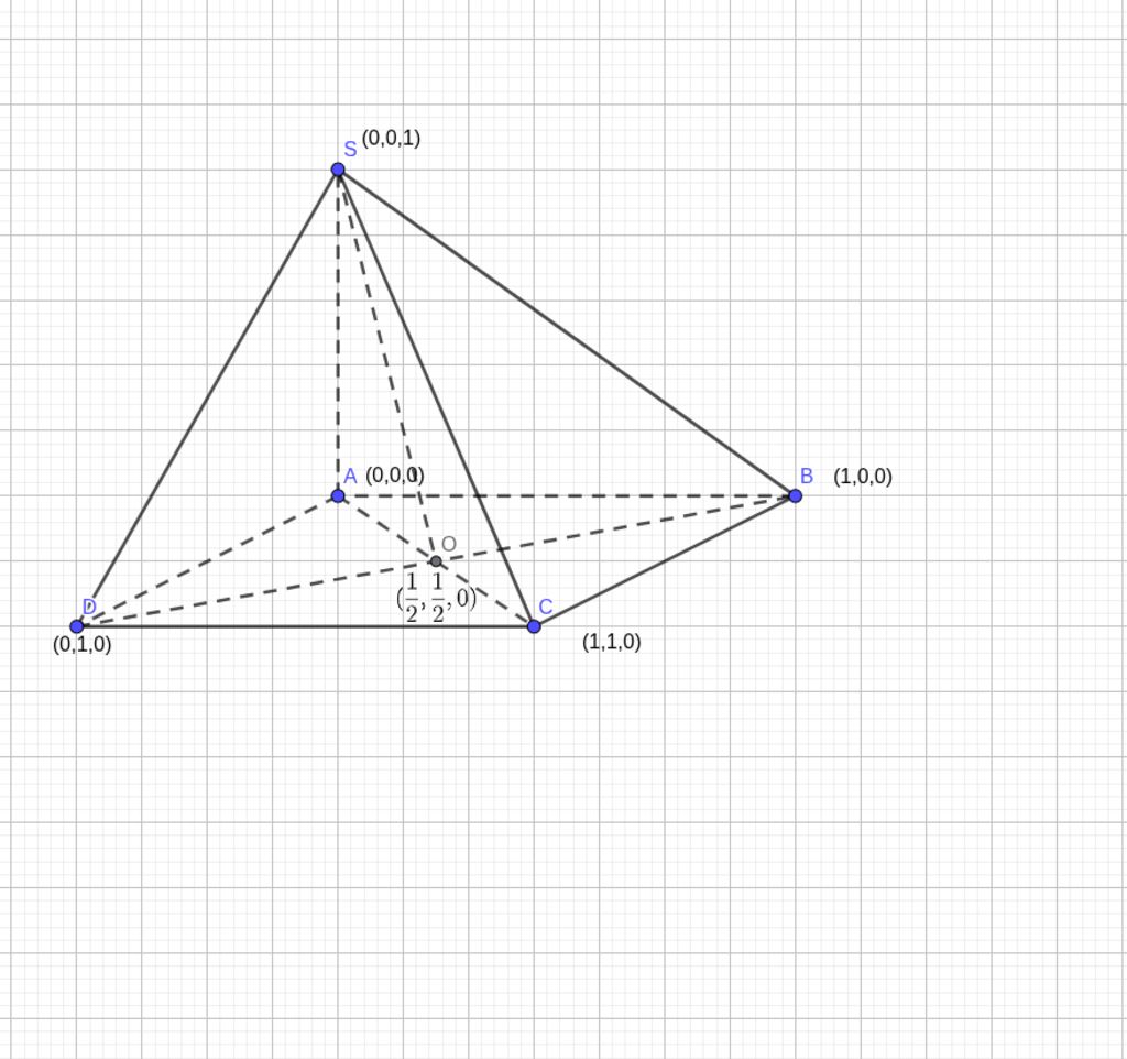 $\to SB=SD=BD=\sqrt2, SO=\dfrac{\sqrt2\cdot \sqrt3}2=\dfrac{\sqrt6}2$