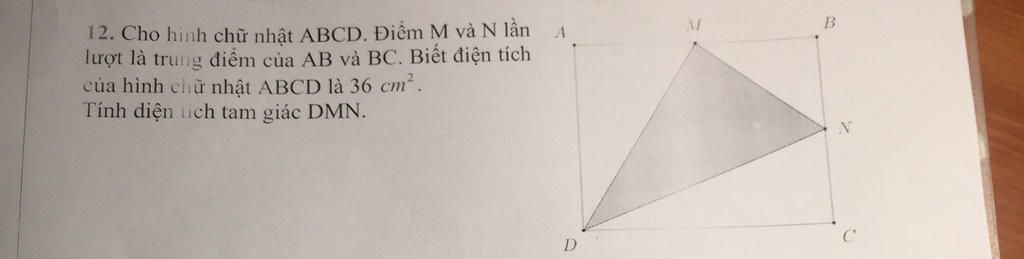 Diện tích tam giác `DMN` là: `36-(9+4,5+9)=13,5 \ (cm^2)`