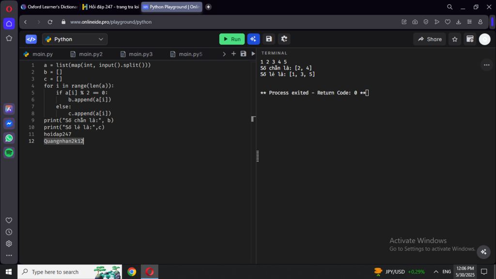 nhập mảng a gòm n phần tử rồi in ra các số lẻ và chẵn trong mảng python ạ