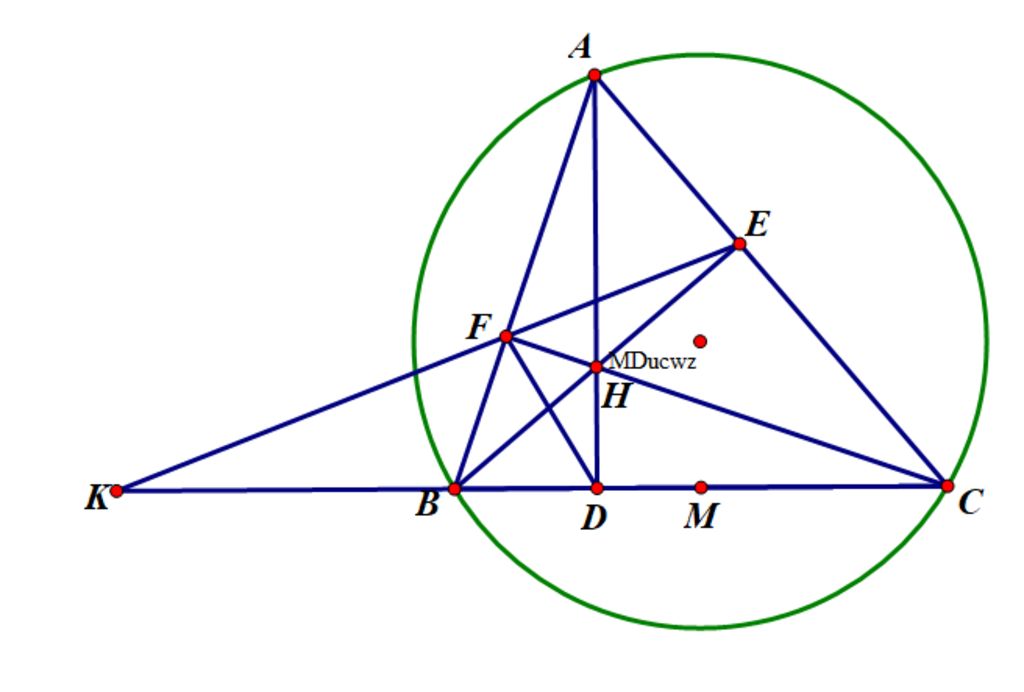 2) Cho tam giác nhọn ABC (AB < AC) nội tiếp đường tròn (O) và có các đường cao AD, BE, CF cắt nhau tại trực tâm H. a) Chứng minh bốn điểm A, F, D, C cùng thuộc một đường tròn. b) Gọi M là trung điểm của đoạn thẳng BC, K là giao điểm của hai đường thẳng BC và EF. Chứng minh FB là tia phân giác của góc DFK và KD .KM=KE.KF . c) Chứng minh MF là tiếp tuyến của đường tròn ngoại tiếp tam giác KDF.