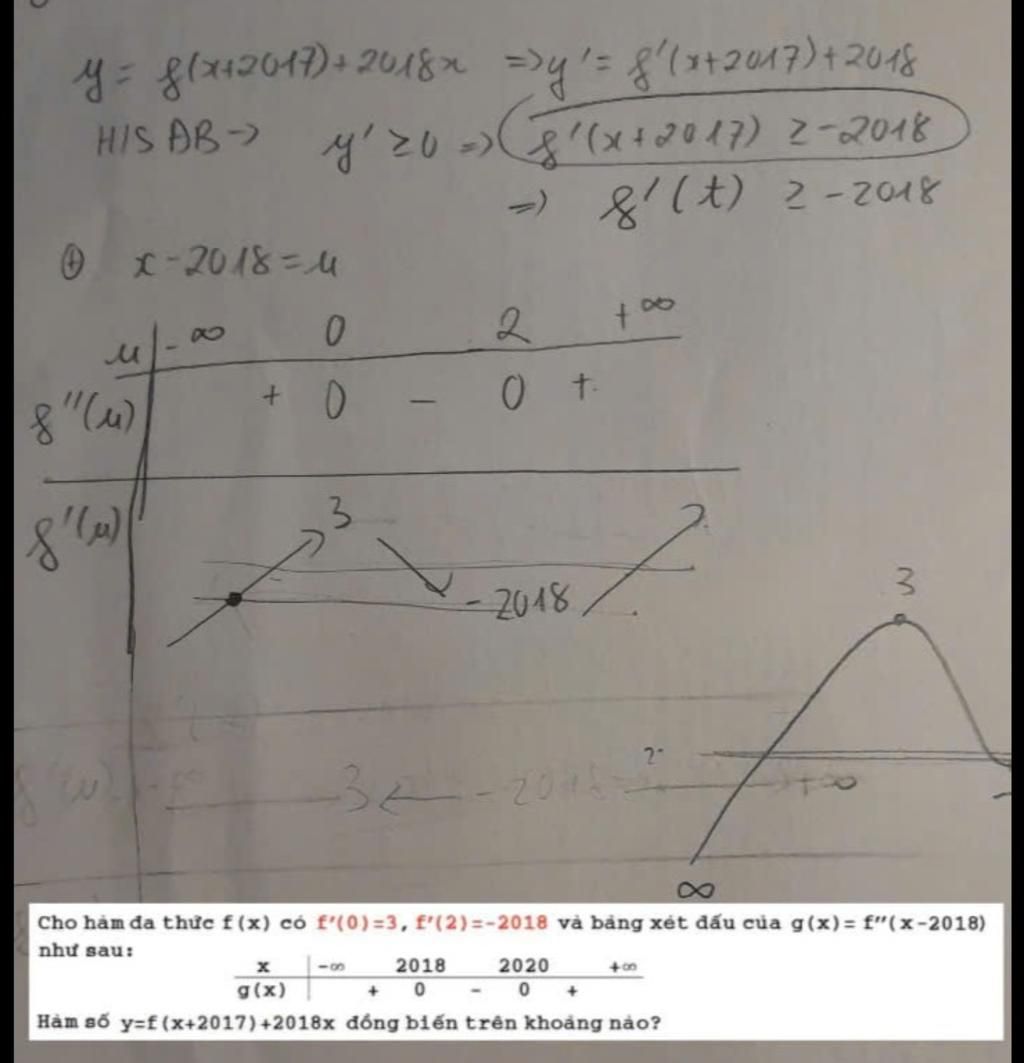 Cho hàm đa thức f(x) có f(0)=3,f'(2)=-2018 và bảng xét dấu của g(x)= f”(x−2018)