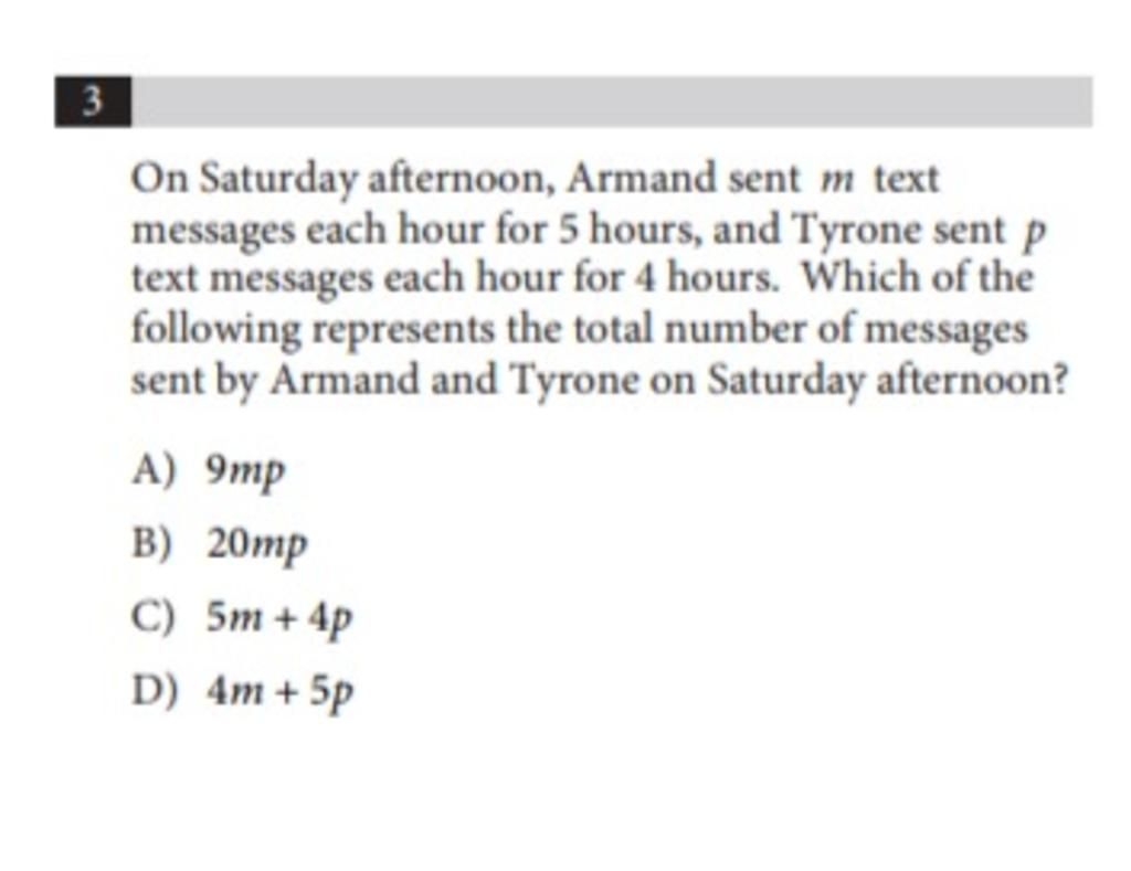 Vào buổi chiều thứ bảy, Armand đã gửi `m` tin nhắn mỗi giờ trong 5 giờ, và Tyrone đã gửi `p` tin nhắn mỗi giờ trong 4 giờ.