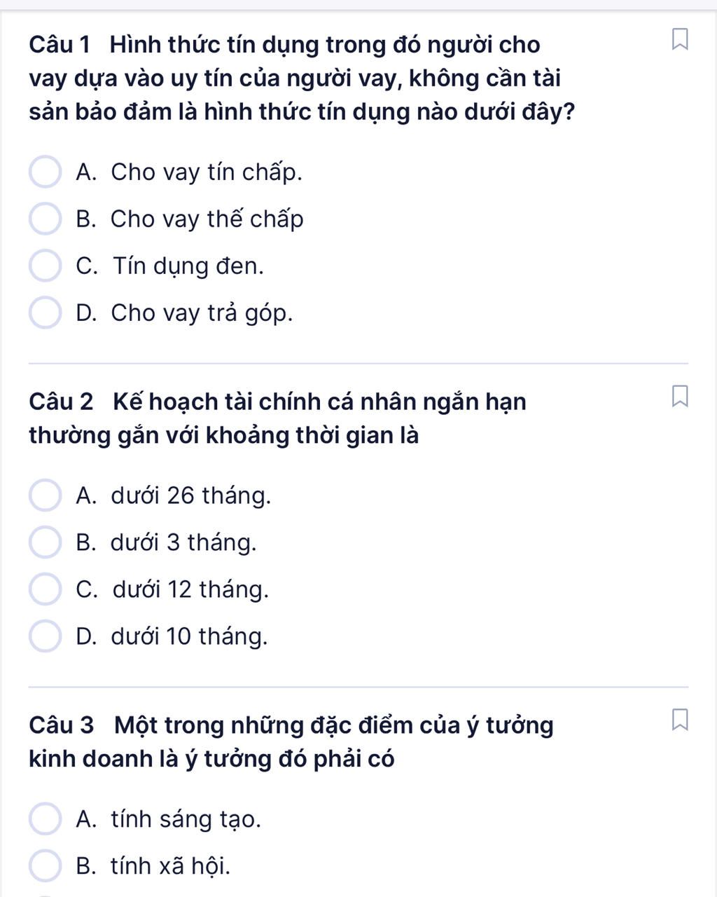 1.A Vì tín chấp có nghĩa là không cần thế chấp tài sản, chỉ dựa vào sự uy tín của người đi vay.