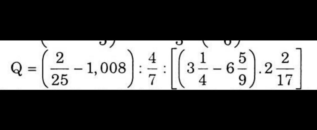 `Q=(2/25-1,008):4/7:[(3 1/4-6 5/9)*2 2/17]`