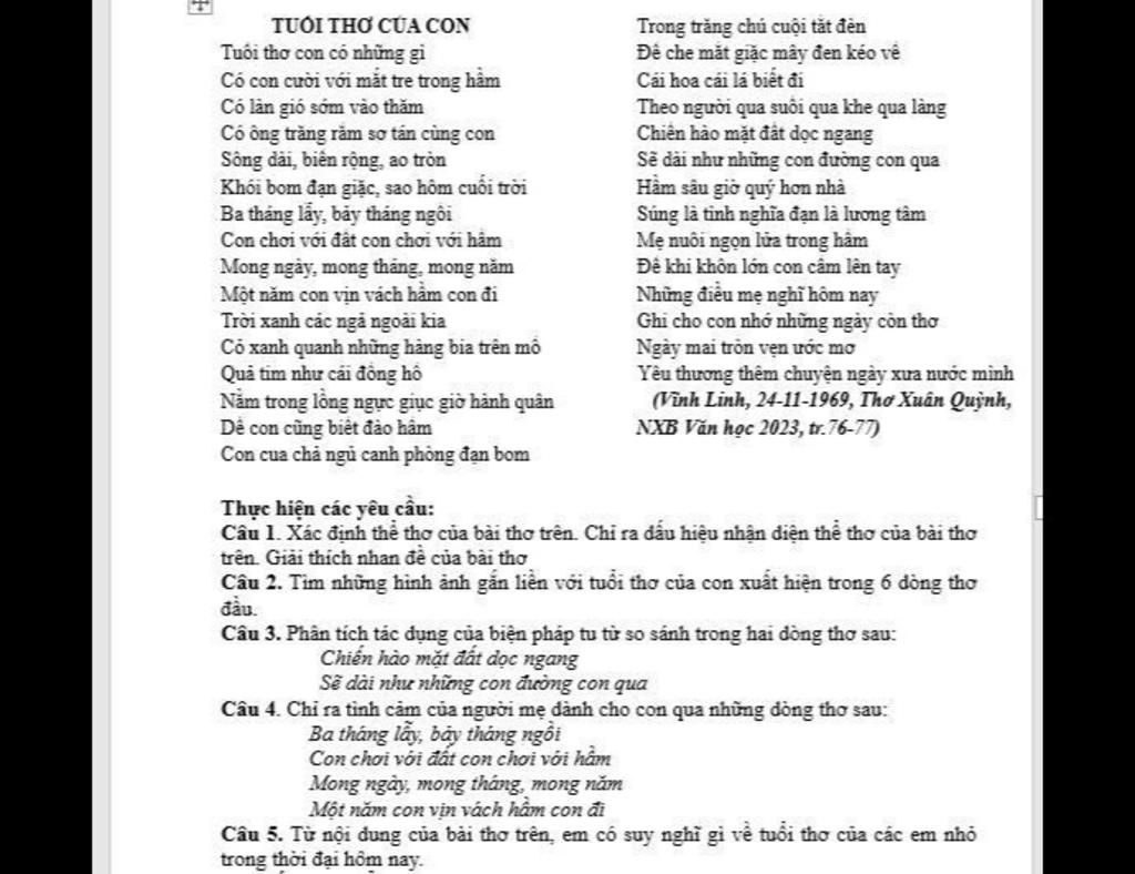 5.Bài thơ gợi lên sự may mắn và nhân văn của các em nhỏ trong thời đại hôm nay, không phải chứng kiến và trải qua những khó khăn, gian khổ như thế hệ trước trong thời chiến tranh.