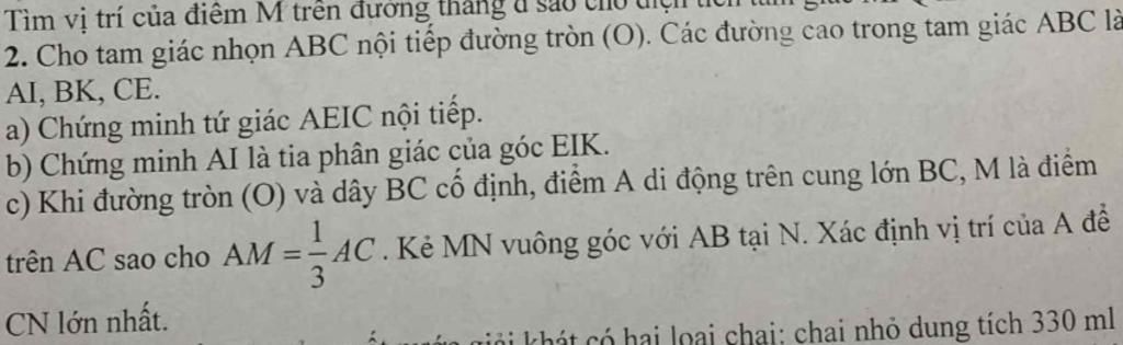 b) Gọi H là giao điểm của 3 đường cao AI,BK,CE.