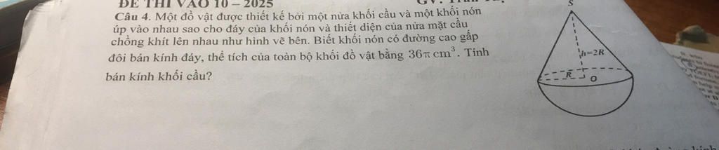`V = V_(nửa cầu) + V_(nón) = 2/3 \pi R^3 + 2/3 \pi R^3 = 4/3 \pi R^3 (cm^3)`