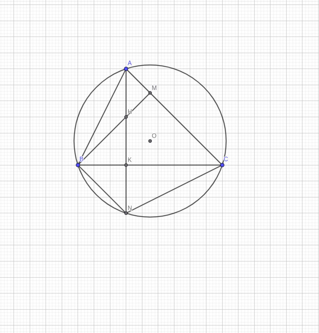 Cho tam giác nhọn ABC (AB<AC) nội tiếp đường tròn (O). Các đường cao AK, BM cắt nhau tại trực tâm H của tam giác ABC. Tia AK cắt đường tròn (O) tại điểm N (khác A). Chứng minh: a) CBM CAK b) Tam giác BHN cân.