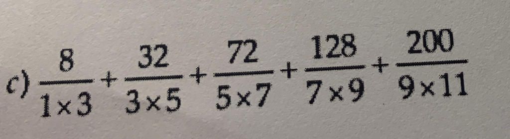 `c) 8/(1 xx 3) + 32/(3 xx 5) + 72/(5 xx 7) + 128/(7 xx 9) + 200/(9 xx 11)`