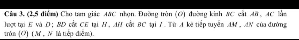 Câu 3. (2,5 điểm) Cho tam giác ABC nhọn. Đường tròn (O) đường kính BC cắt AB, AC lần