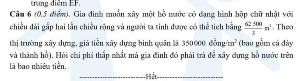 `=>` Vậy chi phí thấp nhất để xây hồ nước là `350000xx3750=1312500000` đồng