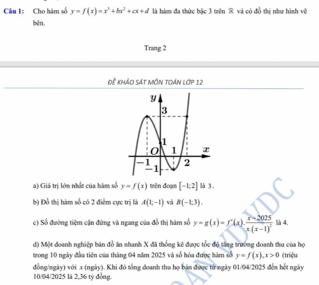 $d) f(x) = x^3 - 3x + 1$ là tốc độ tăng trưởng doanh thu của doanh nghiệp $X$ trong $10$ ngày đầu tiên