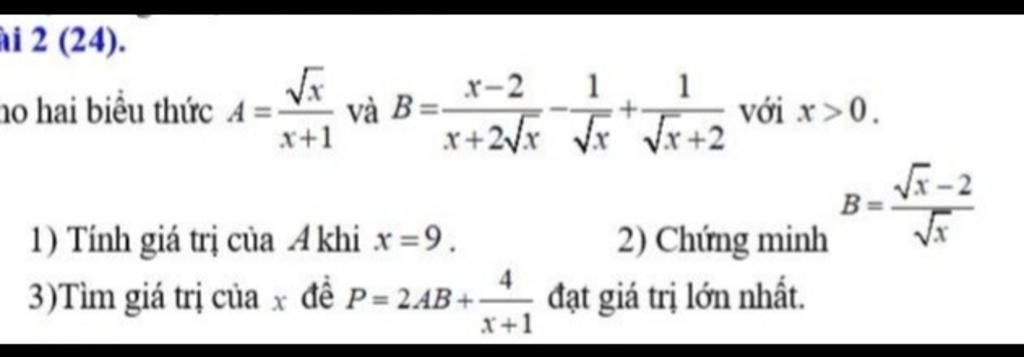 `P = 2AB = 2 . (\sqrt{x})/(x+1) . ( \sqrt{x} - 2 )/(\sqrt{x}) + 4/( x + 1 )` ĐKXĐ `x > 0`