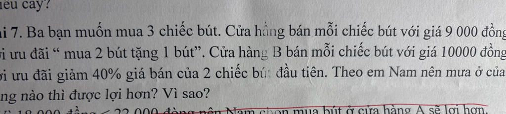 Vì của hàng `A` có ưu đãi "mua `2` tặng `1` bút" nên số tiền chỉ được tính là `2` .