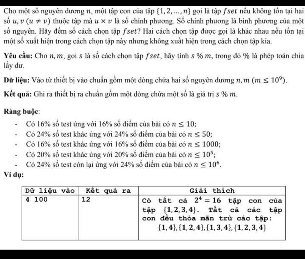 +) xét tất cả tập con được gọi là hợp lệ nếu không có hai phần tử nào trong tập đó mà tổng của chúng là một số chính phương (ví dụ: 1, 4, 9, 16, 25...)