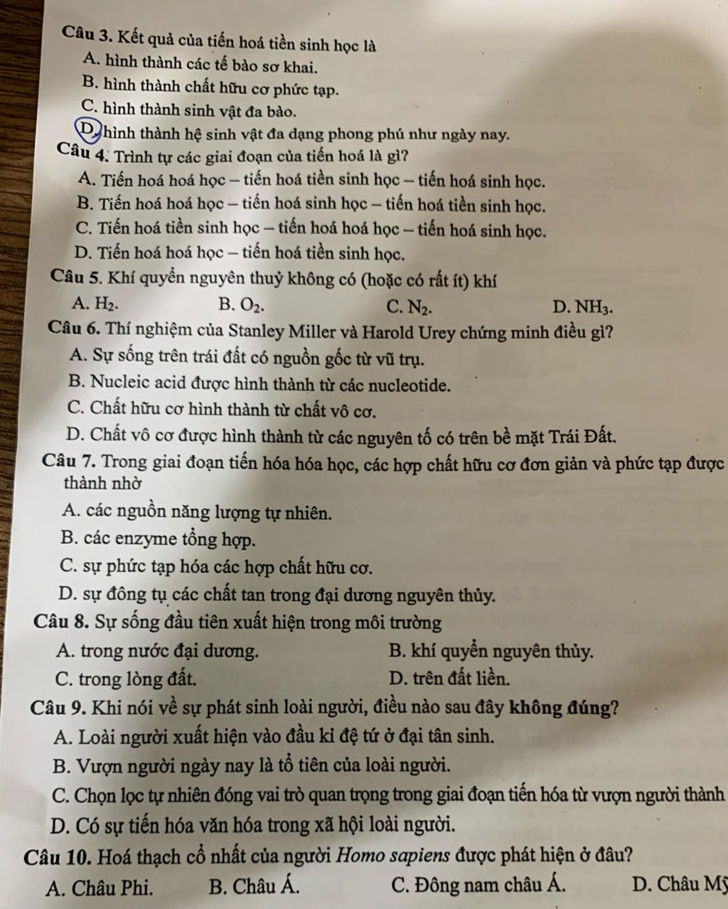 Câu 4: A. Tiến hoá hoá học → tiến hoá tiền sinh học → tiến hoá sinh học.