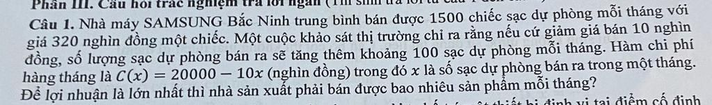 Gọi `x` là số lượng sạc dự phòng bán ra mỗi tháng.