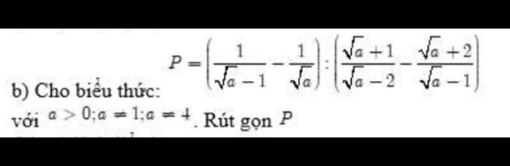 `P = ( 1/(sqrta - 1) - 1/(sqrta) ) : ( (sqrta+1)/(sqrta-2) - (sqrta+2)/(sqrta-1) )` `( a > 0 ; a \ne 1 ; a \ne 4 )`