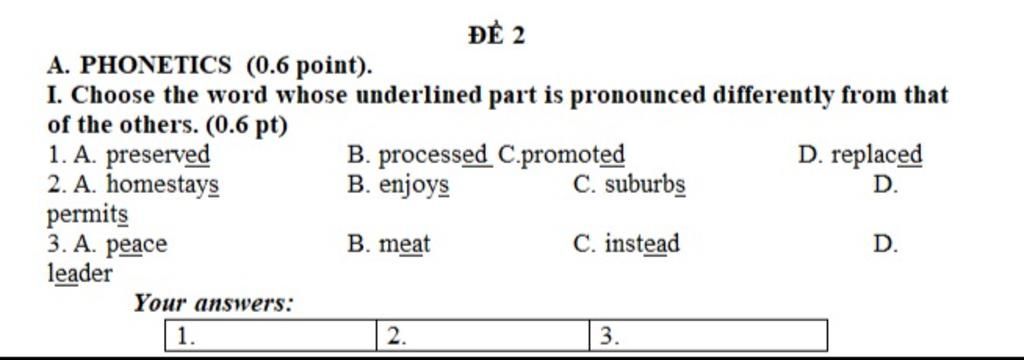 1. Không đáp án đúng /d/ - /t/ - /id/ - /t/