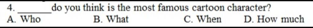 `->` Câu hỏi này đang nói về "the most famous cartoon character" là đang hỏi về người, noun (danh từ) nên ta chọn "Who"