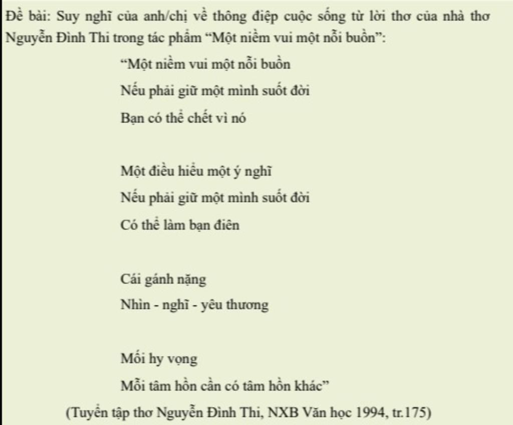 Bài thơ "Một niềm vui một nỗi buồn" của Nguyễn Đình Thi đã gửi gắm một thông điệp đầy nhân văn rằng con người không nên cất giấu mãi những cảm xúc, suy nghĩ, hay nỗi niềm của mình trong cô đơn. Niềm vui, nỗi buồn, một điều hiểu, hay một ý nghĩ nếu phải giữ mãi trong lòng mà không được sẻ chia có thể trở thành gánh nặng, thậm chí là thứ làm ta tổn thương, đau khổ hay điên dại. Bởi con người vốn là một sinh thể xã hội, ta cần những tâm hồn khác để thấu hiểu, cảm thông, để san sẻ những cảm xúc chân thành. "Mỗi tâm hồn cần có tâm hồn khác" câu thơ giản dị nhưng sâu sắc ấy như một lời nhắn nhủ rằng hãy biết mở lòng, biết nói ra và lắng nghe, vì đó chính là cách để con người chữa lành và hy vọng. Bài thơ không chỉ nói về nỗi cô đơn mà còn hướng đến ánh sáng của tình yêu thương và sự kết nối giữa người với người trong cuộc sống.