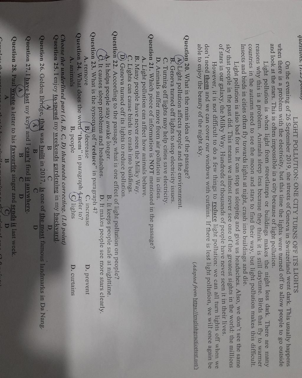 ⇒ ND chính : Ô nhiễm ánh sáng tác động đến con người và môi trường.