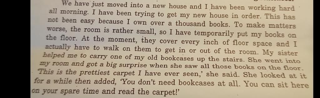 Chúng tôi vừa chuyển đến một ngôi nhà mới và tôi đã làm việc cật lực cả buổi sáng. Tôi đã cố gắng sắp xếp lại ngôi nhà mới của mình. Điều này không hề dễ dàng vì tôi sở hữu hơn một nghìn cuốn sách. Để mọi việc tệ hơn, căn phòng khá nhỏ, vì vậy tôi tạm thời đặt sách của mình trên sàn nhà. Hiện tại, chúng che phủ mọi inch không gian sàn và tôi thực sự phải đi bộ trên chúng để vào hoặc ra khỏi phòng. Em gái tôi đã giúp tôi mang một trong những giá sách cũ của tôi lên lầu. Cô ấy bước vào phòng tôi và rất ngạc nhiên khi thấy tất cả những cuốn sách trên sàn nhà. "Đây là tấm thảm đẹp nhất tôi từng thấy," cô ấy nói. Cô ấy nhìn nó một lúc rồi nói thêm, "Bạn không cần giá sách chút nào. Bạn có thể ngồi đây vào thời gian rảnh rỗi và đọc tấm thảm!"