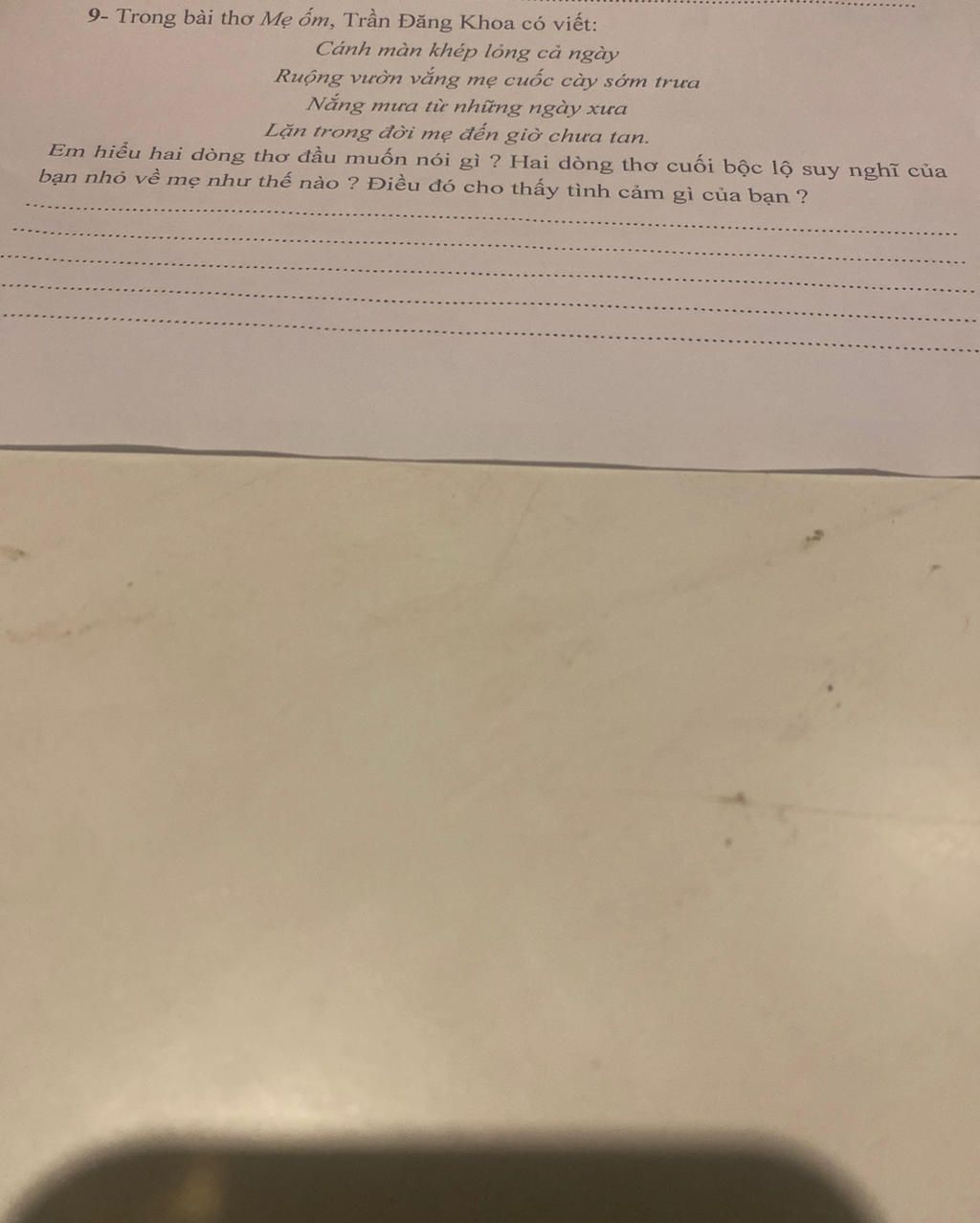 `-` Bn nhỏ không chỉ lo lắng khi mẹ ốm mà còn cảm nhận được cả những hi sinh âm thầm của mẹ trong suốt cuộc đời.