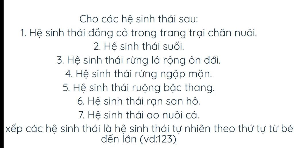 `+`Hệ sinh thái rạn san hô: Có thể từ quy mô nhỏ đến lớn, nhưng một rạn san hô thường có diện tích nhất định và nhỏ hơn nhiều so với một khu rừng rộng lớn.