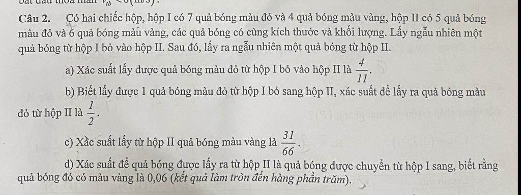Câu 2. Có hai chiếc hộp, hộp I có 7 quả bóng màu đỏ và 4 quả bóng màu vàng, hộp II có 5 quả bóng