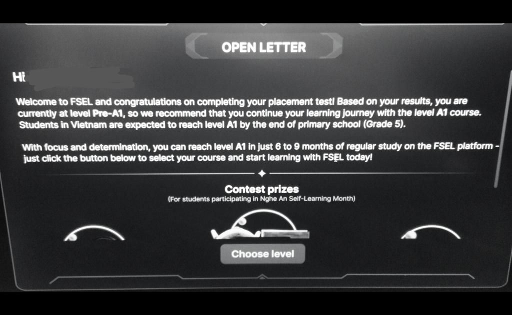Chào mừng bạn đến với FSEL và chúc mừng bạn đã hoàn thành bài kiểm tra đầu vào! Dựa trên kết quả của bạn, hiện tại bạn đang ở trình độ Pre-A1, vì vậy chúng tôi khuyên bạn nên tiếp tục hành trình học tập với khóa học trình độ A1. Học sinh tại Việt Nam được kỳ vọng sẽ đạt trình độ A1 vào cuối bậc tiểu học (lớp 5).